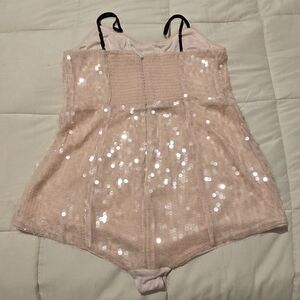 The most adorably feminine? two separate pieces, slip dress with paillette body suit. I bought it to wear for a bridal shower and it didn't happen. NWOT. Only tried on. 52 inches long. So pretty on.