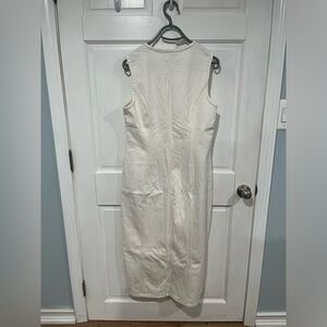 Slim-fitting column midi dress in our soft denim fabric, featuring a v-neckline, fully functional button-through detail, on-trend seaming details and center-front slit detail. Imported.