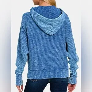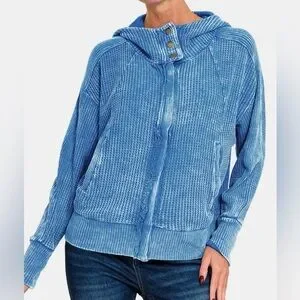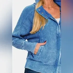 NWT Zenana Ocean Blue Acid Wash Zip Up Waffle Knit Hooded Jacket