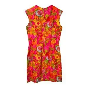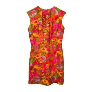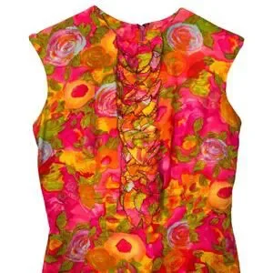 Vintage 60s Handmade Floral Sleeveless Dress. Stunning vintage hand made sheath dress. Vibrant hot pink, orange, greens color combo. Ruffle details on front. Back metal zipper closure. Lined.