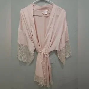 Flora Nikrooz• The Gabby wrap in pink and lace. Sz Medium, 36in long and 24in p2p. In great used condition and missing belt, but can be replaced. Has an inner tie and 100% polyester. Has a gorgeous lace detail and is a light pink.