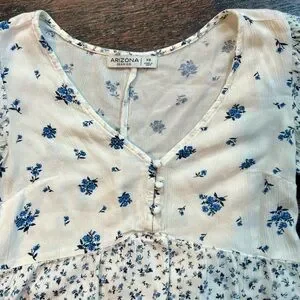 Blue and white Arizona jean brand 3/4 sleeve blouse. Size XS, perfect condition. Slightly cropped. Only worn once. Button detail on neckline.