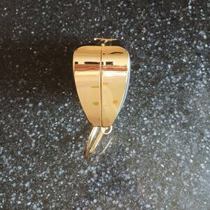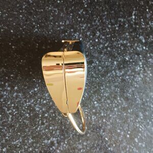 Satin-like black fabric with gold-tone metal detail. In beautiful condition! The closure has a rhinestone inset. Interior has two side storage areas with a middle zip compartment. Perfect for any season.