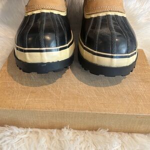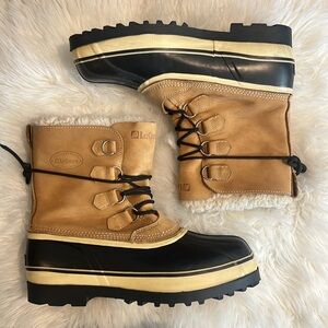 VGUC size 13. Color is Ian and black. Rubber shoe and suede leather shaft. Lace up with metal rings, removable felted wool and Sherpa insert. JS-10