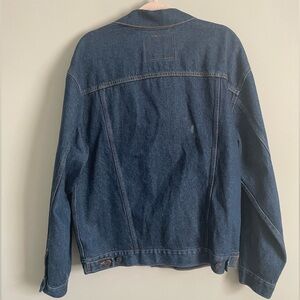 This vintage Levi’s trucker jacket is a great addition for your closet. It has three racing patches and three buttons. There is a white spot on the back of the jacket.