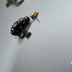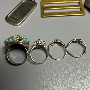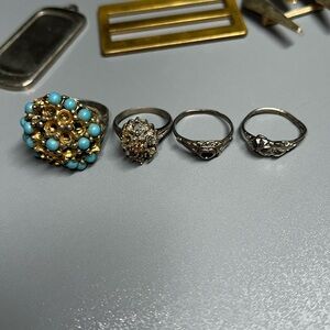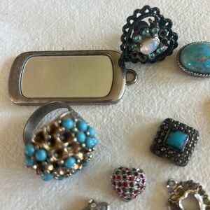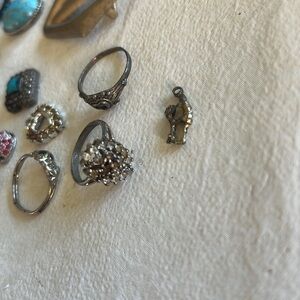 A vintage lot of 16 items; 4 rings, 5 charms, 1 screw-on earring, 2 gemstones(turquoise?) & 3 ???. All need repair's; i.e. gems replaced/added & all need to be cleaned really good. None of them are stamped(that I can see @ least) although only 1 piece; ring shown in last pic, is attracted to a magnet. Selling as is.