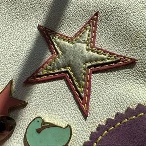 Never carried but flawed. The gold paint peeled off the 1 and there is some discoloration to the gold star on front. Interior even has original sticker inside pocket. About 10”x6”x3”
