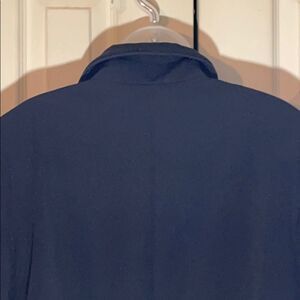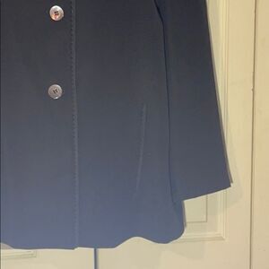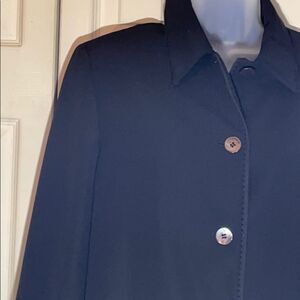 Black button up blazer in a straight front cut with a little swing at the bottom