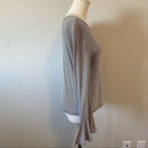 A classic black and white striped long sleeve featuring cute bell sleeves for a twist and making it anything but ordinary! It has a modern 70s vibe!