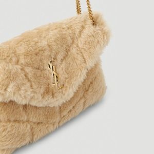Cream Puffer shoulder bag from Saint Laurent. Crafted from lamb fur, this item fastens with a magnetic snap and is complete with an antiqued gold-tone logo appliqué, strap reinforced with a chain, antiqued gold-tone metal hardware and one internal compartment with one zip pocket.
