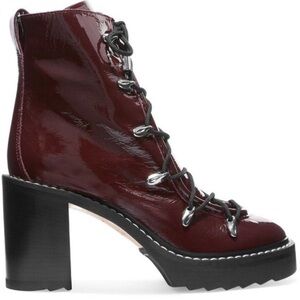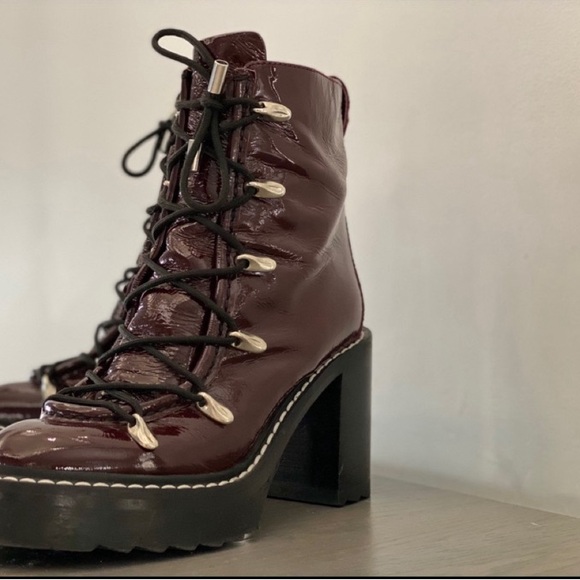 Burgundy patent leather platform hiking boot amps up any Fall or Winter style.