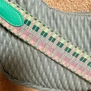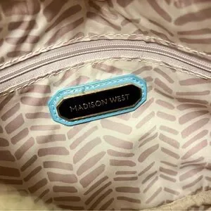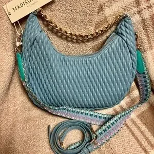 Brand new Madison West quilted vegan leather crescent bag. This bag is so supple and soft. It has a gold chain handle, removable solid blue crossbody strap and a removable multicolored guitar type strap. It’s so versatile and absolutely beautiful.