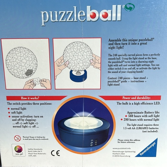 Wow, this looks like a BEAUTIFUL AMAZING Stained-Glass puzzle for the avid puzzler (like me) and will be a GREAT gift item for sure...it's NEW, it must be RARE, HARD TO FIND, in original sealed, undamaged box and packaging, 240 plastic curved pieces with a LED lighted stand so that you can assemble and use/display it as a night light! How cool is that! No glue required! Instructions included...see the unopened box for more details. I searched and searched for this and can't find it anywhere...so, if you know where one can be, let me know. Bundle it with the other Puzzle Ball in the closet for a special deal!