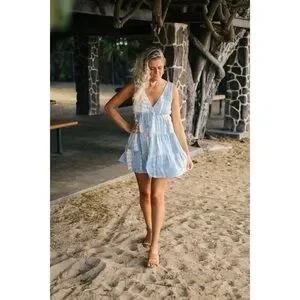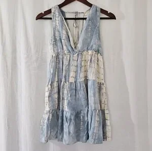 Millibon V-Neck Tie-Dye Tiered Mini Dress in Blue/Cream/Off-White Women’s Size S