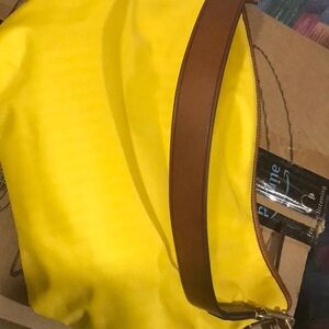 EUC Dooney & Bourke Yellow Hobo shoulder Tote with matching pouch, nothing wrong with tote, no rips, tears or stains. Easy to clean, thick wide 1.25" leather strap, strap length drop is 12", 9.5" L x 13"H x 6" D, nylon can get wet and dries quickly, 4 studded feet, gold accents, outside exterior pocket for cell phone, interior has 3 slip pockets and 1 zip pocket. Pet/smoke free home.