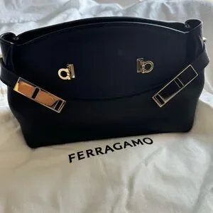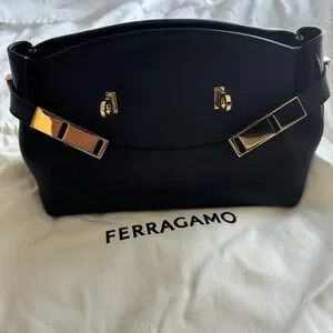 Stunning bag from Ferragamo Hug collection! Excellent condition but some wear on the hardware. Worn only twice. Purchased in NYC Ferragamo SoHo boutique earlier this year February 2024. Straps can be adjusted to make it into a crossbody bag, shoulder bag with the long strap hanging for an elevated edgy look, and can be worn as a clutch. Has internal card slots.