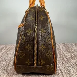 Good to Very Good Condition: obvious signs of usage, including visible scuffs, scratches, and/or color fading/water mark. Handles and interior are in very good condition. No exposed piping. Honey patina vachetta. Zipper runs smoothy. No crack on the canvas. Very small pen mark inside and crayon odor - this style commonly has a wax odor. Pease refer to the pictures. What you see is what you get.