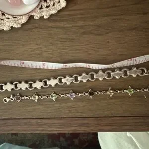 silver bracelets. one has garnet stones and the other has cross shaped silver pieces.