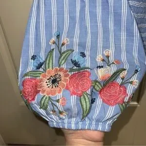 Has beautiful embroidery almost all around the bottom sleeve/hem (see photos) that is in excellent condition