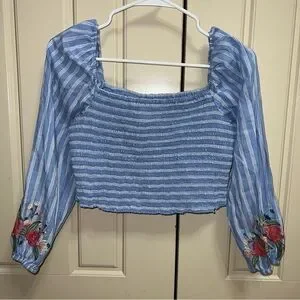 Xhilaration Striped Embroidered Smocked Square Neck Puff Sleeve Crop Top Shirt