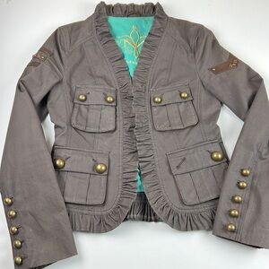 Absolutely stunning blazer jacket with ruffle. ha a small button closure just below chest level.