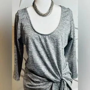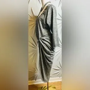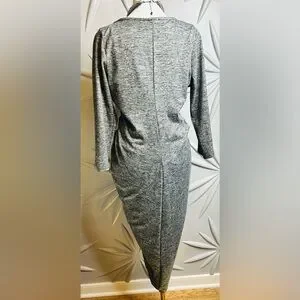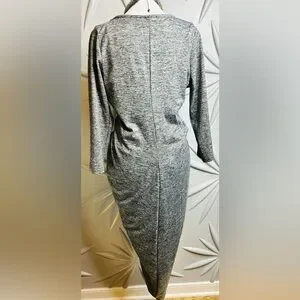 The Vanity Room (NWT) size large gray & white knot front dress with concealed skirt underneath. Sleeves are 3/4 length with deep scoop neck. The dress is one piece. Bust 36”-40”, waist 32”-40”. The dress is too large for my mannequin so it doesn’t allow you to see the skirt that’s attached underneath. See last photo of concealed skirt. Fabric polyester 92%, spandex 8%. ACCESSORIES NOT INCLUDED!