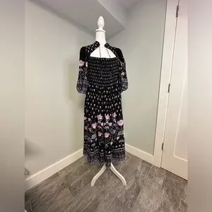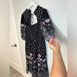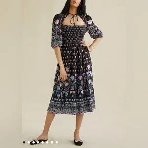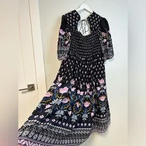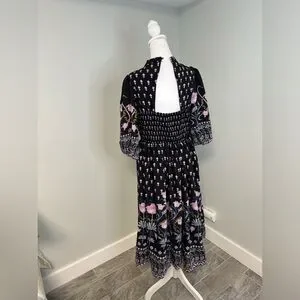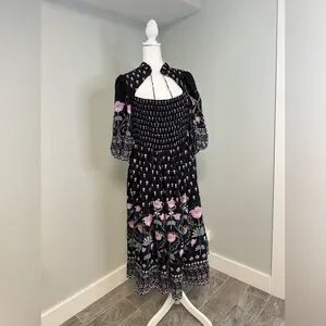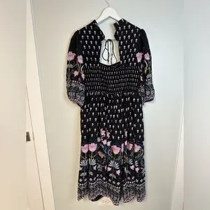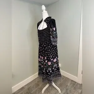 Anthropologie Dasha Smocked Midi Floral Tie Bohemian Dress Size Large