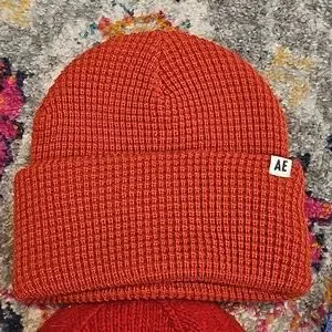 2 American Eagle beanies Never worn. ones Tan one is dark red/orange color.