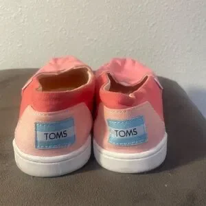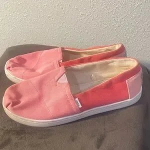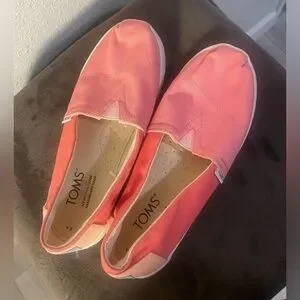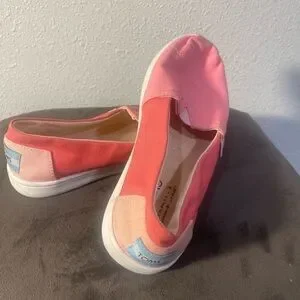 Selling a pair of pre-loved Toms slip-on shoes in a kids' size 2. These shoes are comfortable and lightweight, perfect for casual wear. They feature a lovely pink and coral color combination. While they have some signs of wear on the soles, the upper part is in great condition. These shoes are easy to slip on and off, making them perfect for active kids.