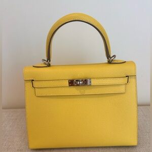 Hermes Kelly 25 in epsom leather. Lime color with palladium hardware.