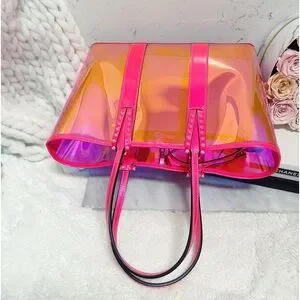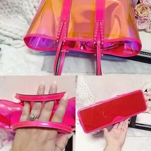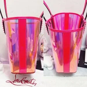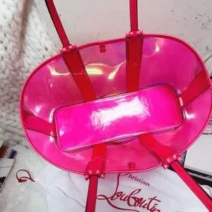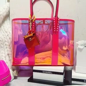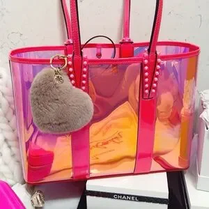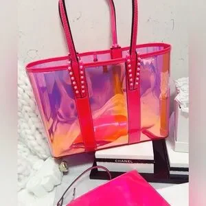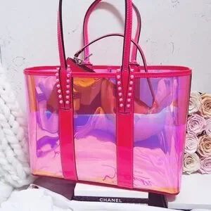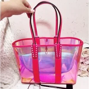 Authentic CHRISTIAN LOUBOUTIN PVC Spikes East West Cabata Tote in Pink. Made in Italy- This trendy tote is crafted of multicolor metallic pvc. It features pink patent leather trim, leather straps with matching iridescent studs on the leather anchors. The top is open to a matching interior with a bright pink patent leather. Brand new never been used. Includes pictured dust bag & orange non branded bag charm as a gift only. ** POUCH no longer included** heart / other charms are not included unless previously arranged. Message for further details, photos or offers.