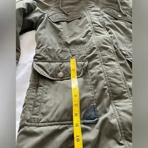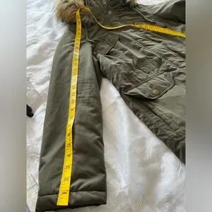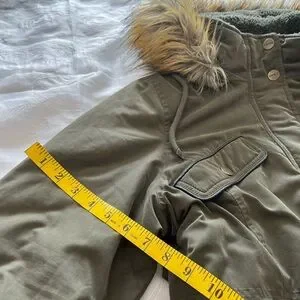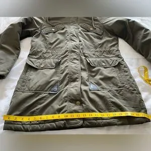 DKNY Women’s Large Hunter Green Long Sleeve Removable Faux Fur Lined Draw String Hood Button/Zip Coat. Multiple Front Pockets In er Draw String for Waist