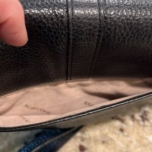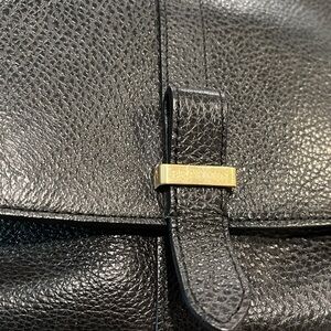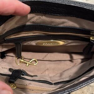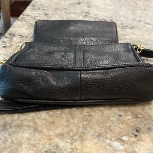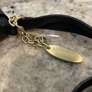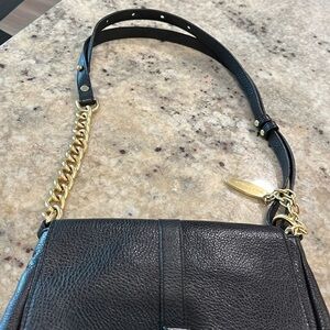 Brahmin black pebbled leather small bag with chunky gold chain accent, magnetic closure and adjustable strap. Classic Brahmin fabric interior with key fob, 2 zippered and sleeve pockets.
