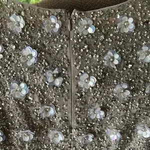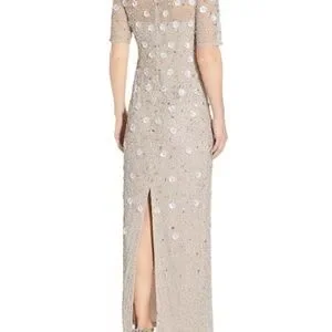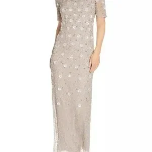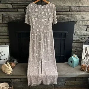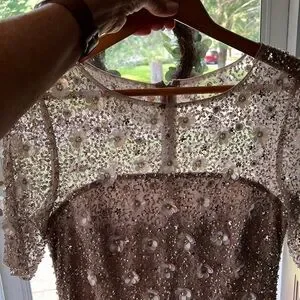 Gorgeous and in excellent condition with no missing beading. This gown has some stretch to it and is extremely comfortable! Armpit to bottom of dress measures 44”. It’s a beautiful coffee/clay color.