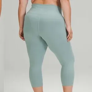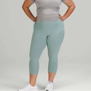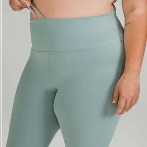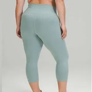 High rise crop with a 21’ inseam in the color misty glade… this is buttery soft and has a pocket in the waistband… it is sweat wicking material and quick drying… these are in excellent condition minimal signs of wash and wear