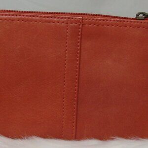 Rare Coach wristlet with embossed horse and carriage logo. Off white nylon check interior. Side zipper opening. Measures 6 x 4 inches. Wrist strap is 6 inches. Some darkened leather on the ends of the wrist straps, otherwise excellent condition!