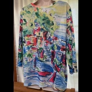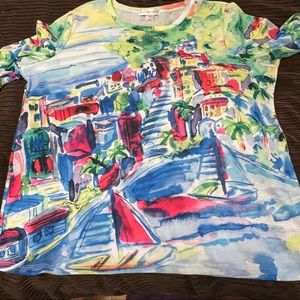 Christopher & Banks Multi Water Colored City Scene 3/4 Sleeve Blouse with rhinstone detailing
