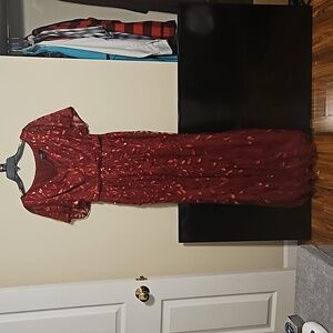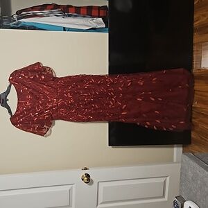 Ever pretty Burgandy shear short sleeve mother of bride or grown dress. Lined body. Worn once. In EUC. Lining 100% polyester and Shell 100% Polyamide.