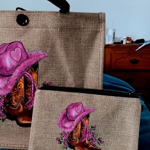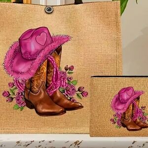 This woman's large capacity tote is super cute and has colorful design on the front and an adorable pink cowboy hat on top of a pair of boots.