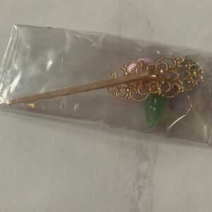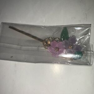 This hair accessory is on a metal Bobby pin. There’s a filigree backing, pastel pink and lavender flowers, a light green leaf, and a teal crystal dangling detail.
