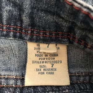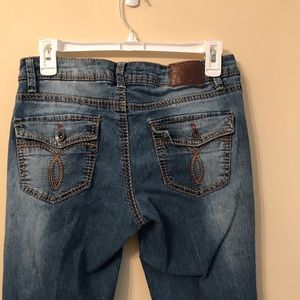 Blue distressed faded boot cut jeans. Back flap pockets. Five pocket style.