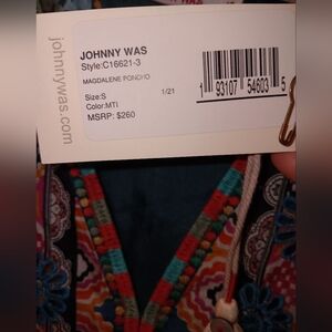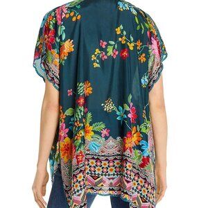 Johnny Was Magdalene 100 percent Silk poncho. NWT! Size S. V-neck with embroidered neck. Short sleeves with slits. Pullover style. Allover print. No flaws! The colors are so vibrant and beautiful.