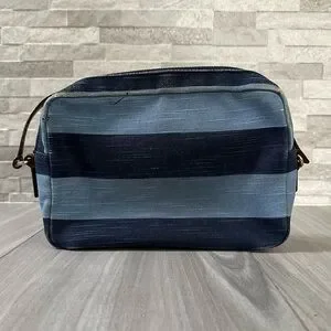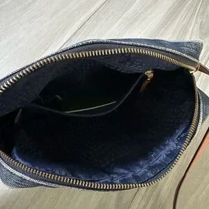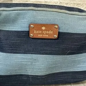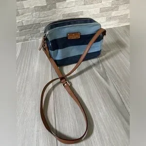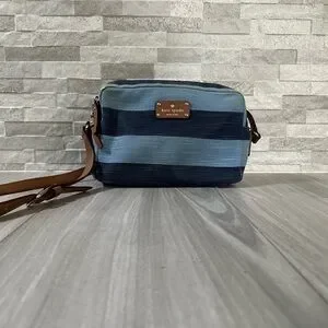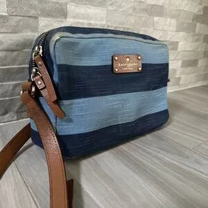 Kate Spade Denim Stripe Crossbody Camera Bag- leather Strap- Blue Brown Gold