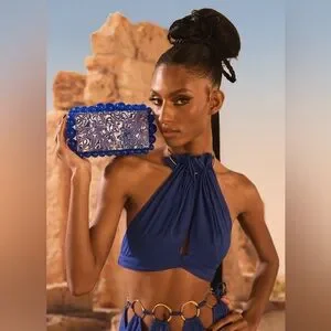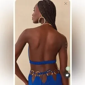 Anahita is an objet d’art. Pleated stretch linen drapes beautifully from the oblong-shaped brushed brass metal ring choker. A central, signature Cult Gaia cutout at the lined bust adds an artistic touch. The elastic back strap holds this cropped piece securely in place and an angled cropped cut flatters at the chest.