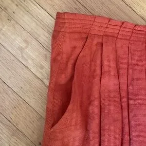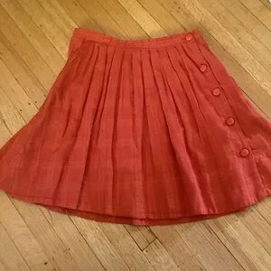 She is a head turner! Soft, warm pumpkin coloured skirt that is the perfect transitional piece for summer to fall. Full pleated mini skirt with all the details. 100% cotton, lined, with pockets. Offset, jute covered buttons add visual interest; waffle textured tone-on-tone plaid.