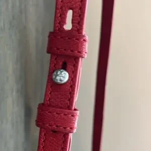 * Made of red textured leather with diamond quilting and an embossed bombé “T.”