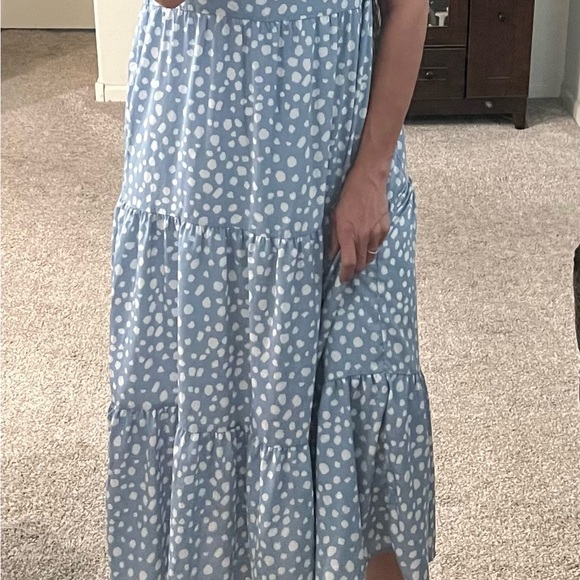 Pretty Garden tiered midi length dress. May be maxi for some depending on height. I am almost 5’8 and it is midi. Relaxed, comfortable and flattering fit with short sleeves that are puffed. Easily dressed up or down. Please see photos for details and measurements. Stock photos and the photos showing the length are the most accurate for color.