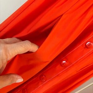 This is a solid orange shirtdress and is perfect for summer and early fall from Worth NY. Worth clothes are created with the utmost quality! Buttons line the front center of this dress and optional roll-up button shirt sleeves adds to its uniqueness. Topstitched in white. It is Lightweight in 72% cotton and elastane.