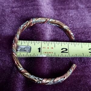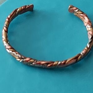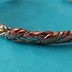 Beautiful twisted mixed metal cuff bracelet in a weave pattern. Stamped "Sergil Lub California on the inside. I believe it is brass, copper and nickel. Approximately 7.25" around and .25" wide. On the heavy side. Pre-owned. Excellent condition. Non-smoking household.