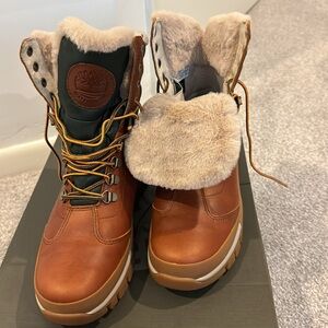 Women’s size 8.5 Timberland winter boots - waterproof. Leather bottom with nylon top and thick soles - partly fuzzy inside.